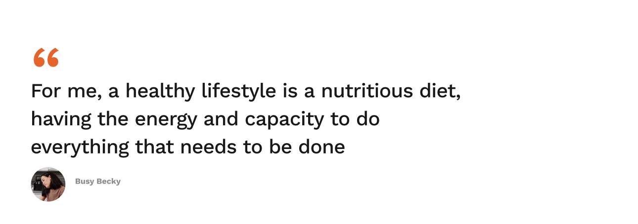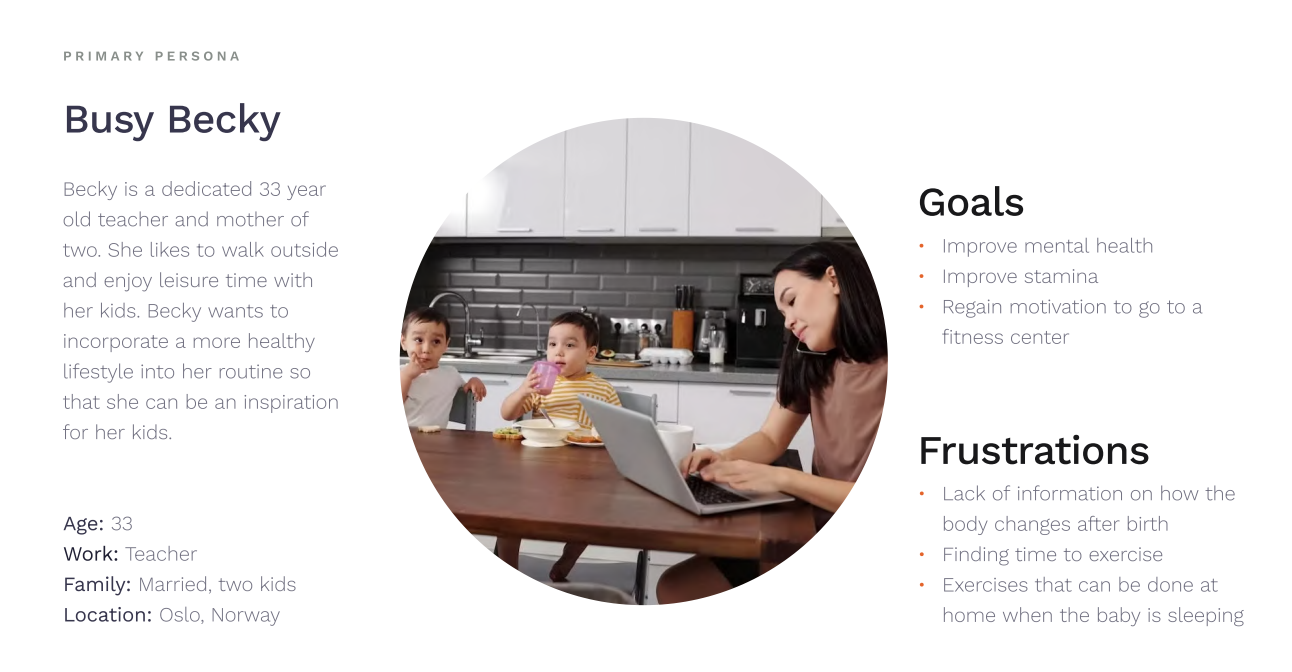 We started by gathering stories. Through interviews, surveys and literature, we saw the same patterns appear: limited time, low energy, interruptions, and uncertainty around post-natal safety. From these insights emerged “Busy Becky,” our primary persona, a warm, determined mother doing her best, yet often stretched thin.