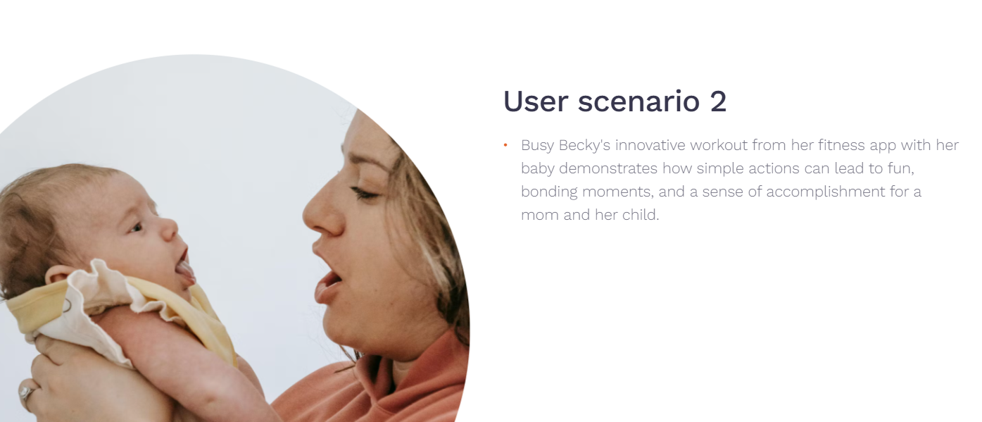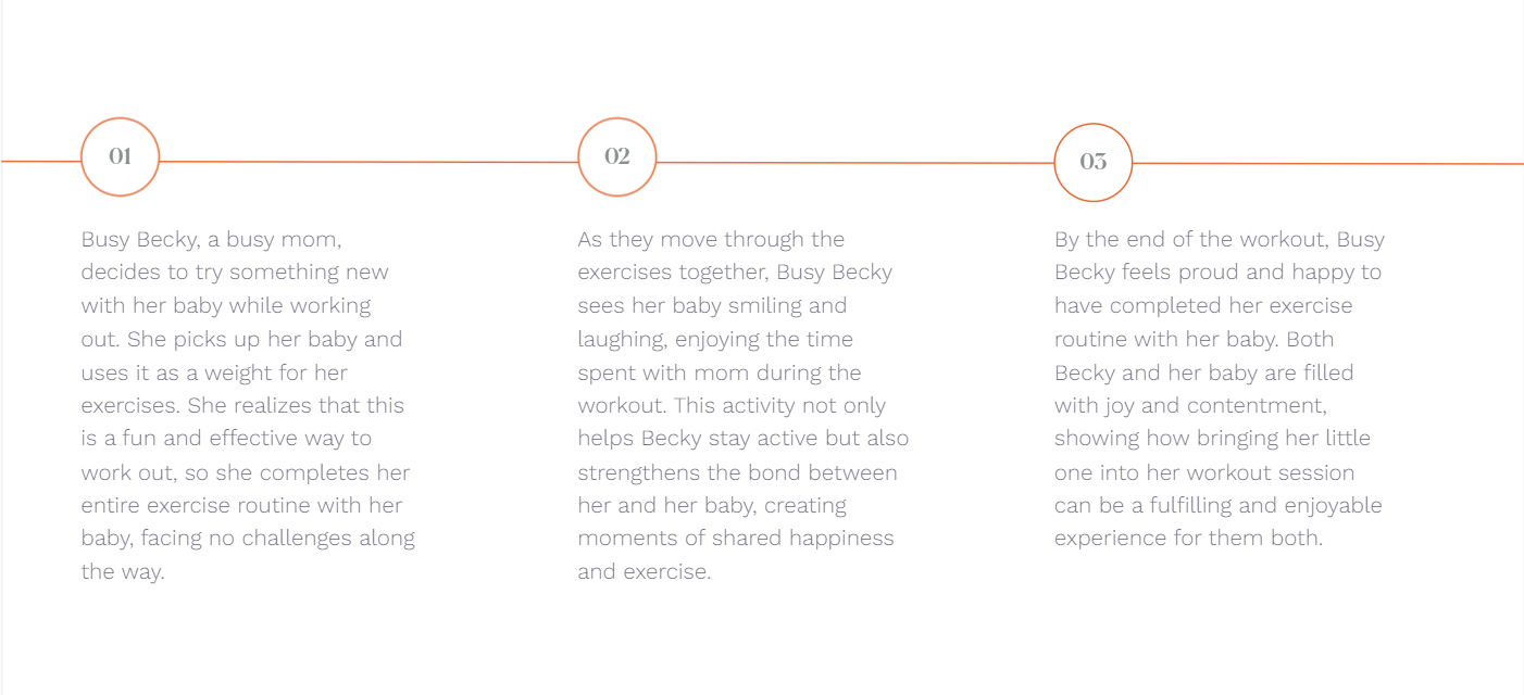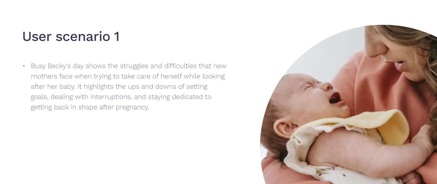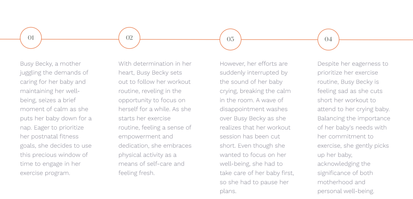 Using Becky’s everyday life as our anchor, we created scenarios that showed both the frustration of interrupted workouts and the joy of moments shared between mother and child. These stories shaped our design decisions: one-hand navigation, quick access to workouts, short video formats, and a calm visual tone.
